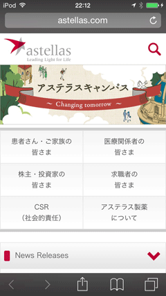 うち1社(デンソー)はスマホサイトへのリンクが用意されていたので、そのリンクをたどった先のスクリーンショットです。スマホサイトが用意されていないサイトもあります。 東京エレクトロンは「iPhone対応ページに訪問しますか?」のダイアログが出て、OKの場合はスマホページ、キャンセルの場合はPCページが表示されました。 横河電機は表示できなかったので、スマホのスクリーンショットがありません(iPodTouchが非力なのかも)。 今回は37社中、16社がPCと同じで、21社がスマホ用の表示が用意されていました(横河はPCと同じでカウント)。 スマホ用の表示があると文字が読みやすかったりするのですが、PCで確認した時のリンクがスマホで閲覧した時にどこにあるのか分からなくなる場合もあります。どちらがよいのかは判断は難しいところです。 |